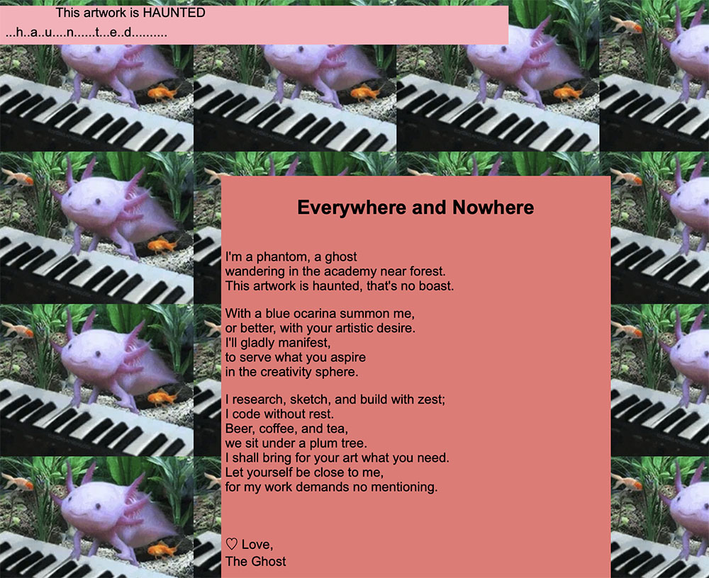 This work explores the hidden interconnections within an artist community. The artist chose to have a "ghostly" presence in the year-end exhibition (Jahresaustellung). Instead of showing her own, independent works, she "manifested" herself through contributing to her classmates' artworks. The tasks performed ranged from artistic research to technical support.