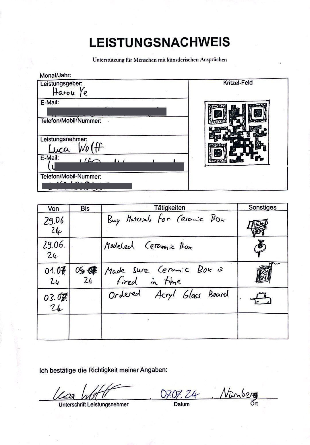 The suspicious-looking QR codes, placed next to each artwork in the exhibition, linked to the webpages where visitors can review the “proof of performance (Leistungsnachweis)” forms signed by the artists that she assisted.